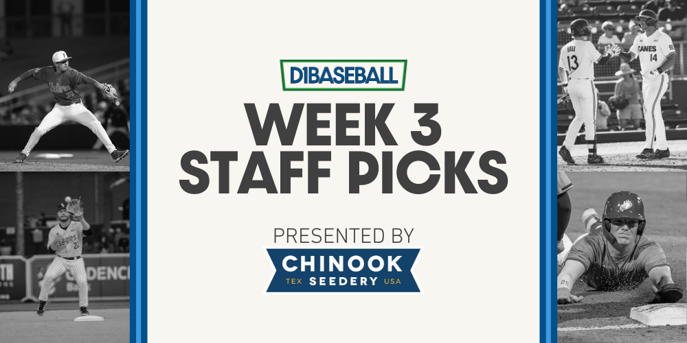 by: D1Baseball StaffFeb 20, 2026 Share on FacebookShare on Facebook Share on XShare on X Share on LinkedInShare on LinkedIn Loading... https://cdn.d1baseball.com/uploads/2026/02/19203410/Week-2-Staff-Picks.png 500 1000 D1Baseball Staff https://cdn.d1baseball.com/uploads/2024/11/21163231/d1-logo.svg D1Baseball Staff2026-02-20 10:10:002026-02-19 20:35:16Staff Picks: Week 2 (2026)